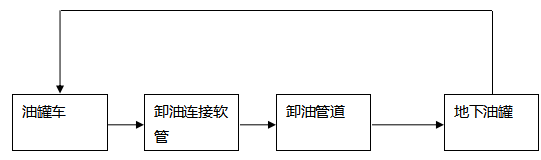 卸油工藝:油罐車行駛至加油站內(nèi)密封卸油口停車處,利用油罐車與地下儲油罐的高位差,采用密閉式卸油。采用油氣回收系統(tǒng),在油罐車卸油過程中,將原來儲油罐內(nèi)散溢的油氣,通過油氣回收地下工藝管線及卸車軟管重新收集至油罐車內(nèi),實現(xiàn)卸油與油氣等體積置換。其工藝流程如下圖: